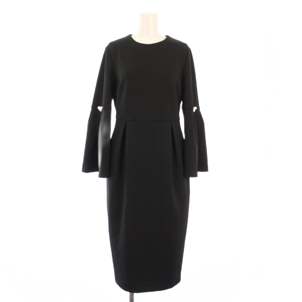 - ユナイテッドアローズ SPONGYフレアスリーブワンピース タイト ひざ丈 長袖 クルーネック ストレッチ フェイクパール 装飾 38 黒