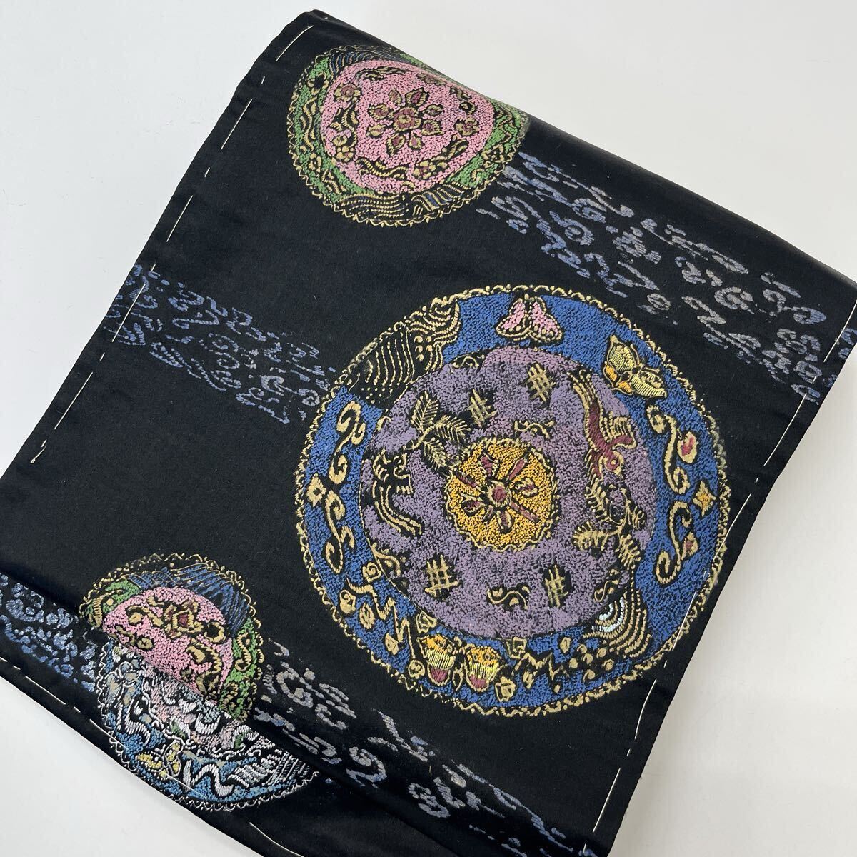 - アンティーク 名古屋帯 黒繻子 丸に更紗 正絹 W- 4624