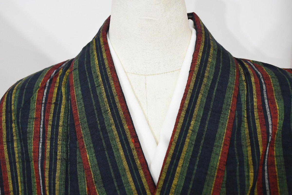 > 紬 つむぎ 縞々 しま 単衣 身丈165cm 裄丈66cm ★着物 pb-3680 桜庭呉服店