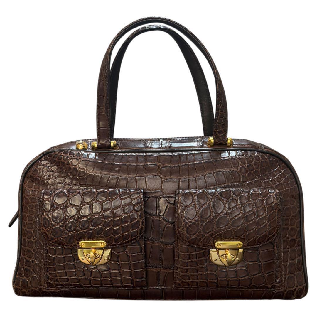 - JRA認定 クロコダイル ハンドバッグ リアルレザー ターンロック ダブルポケット 金具ゴールド ブラウン 茶色