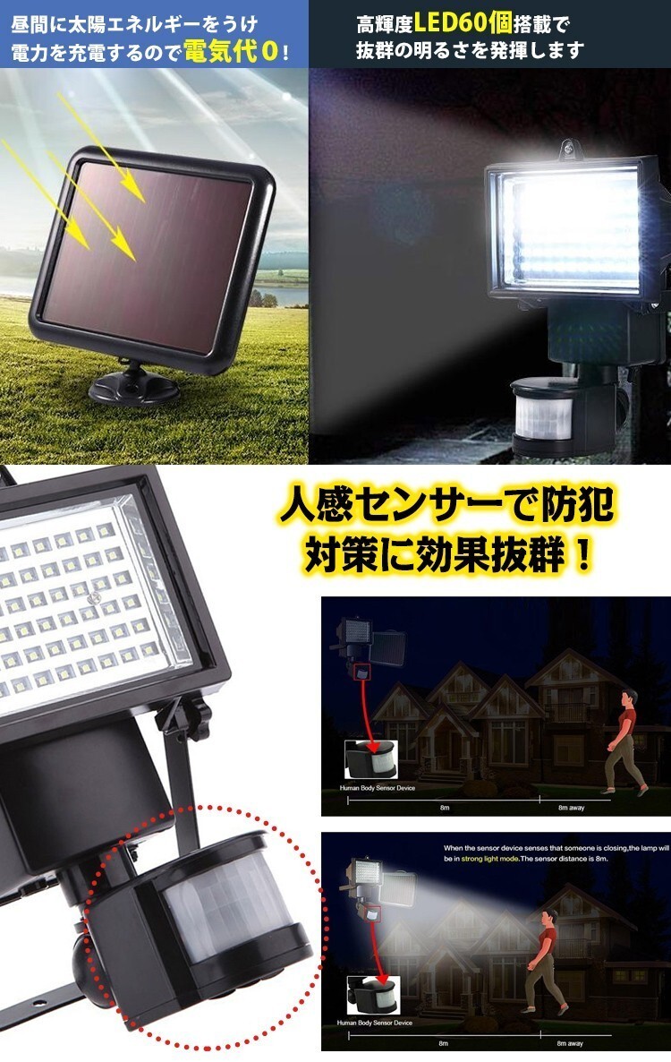 - 期間限定!セール中 送料無料LED 60 人感 センサー 太陽光 ソーラー ガーデンライト 投光器 明るい 調整 車庫 防犯 玄関灯セキュリティsl035