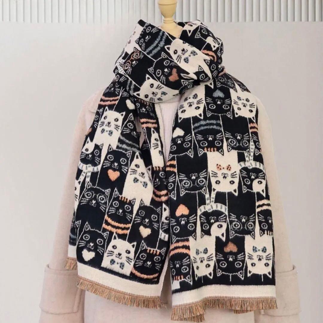 - 売り切りsale ストール マフラー 猫 カシミヤ風 柔らかタッチ 猫 黒