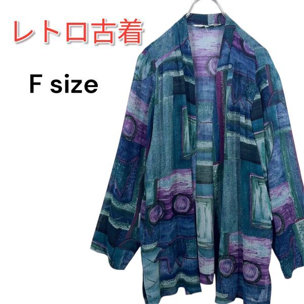 - レトロ古着 デザインシャツ ジャケット アートデザイン レトロ ヴィンテージ 総柄 アート柄 透け感