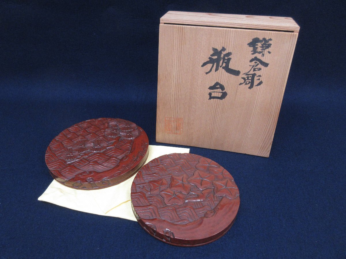 > A6624 漆器「博古堂 鎌倉彫 瓶台 2客」印あり 共箱 木工芸 伝統工芸 茶道具 茶器 和食器 漆器 漆塗 漆芸 瓶座 瓶敷 茶敷 急須台 花台