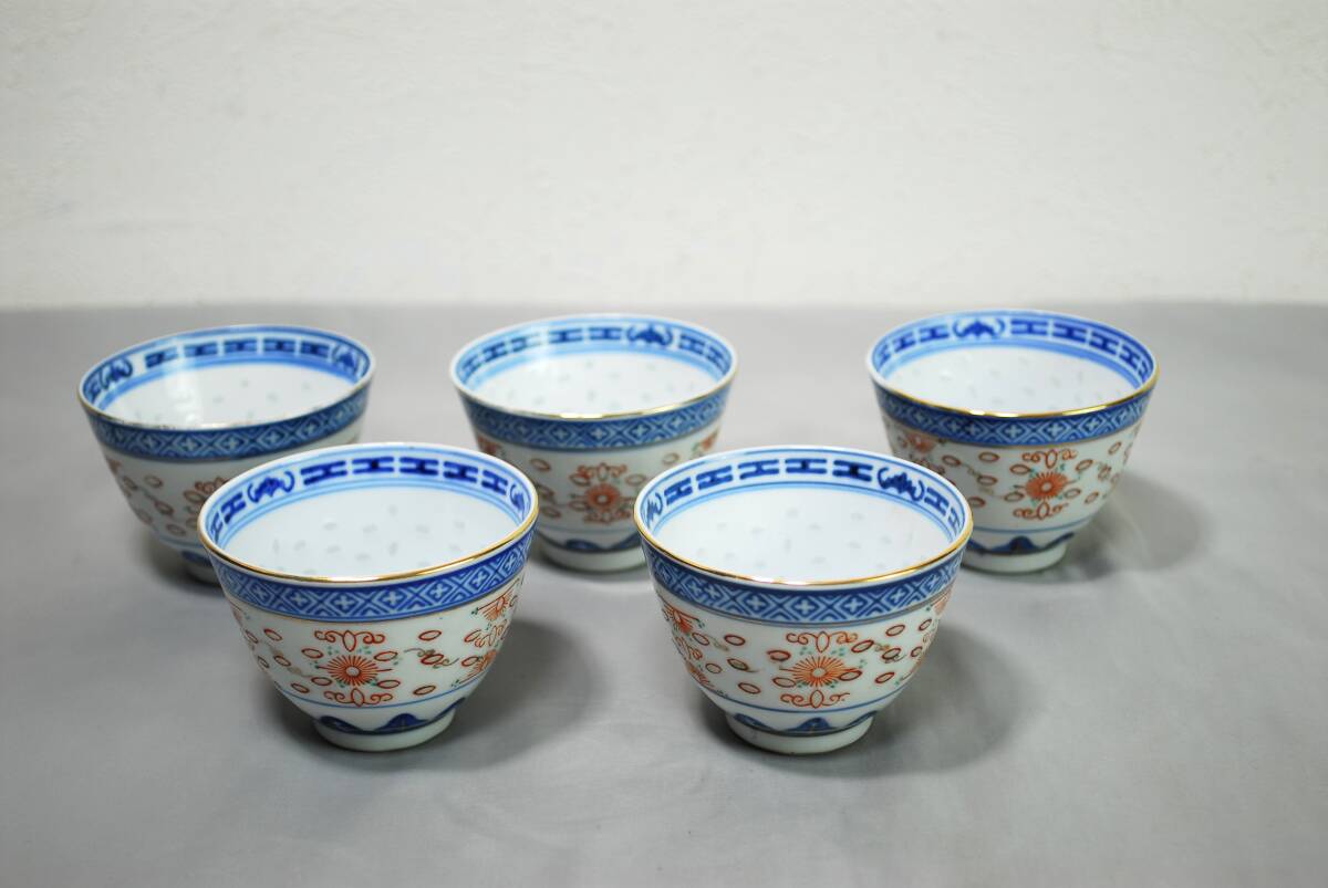 - 中国 景徳鎮製 ほたる 蛍手 湯呑 5客 /検索用 蛍彫 染付 時代物 当時物 玩玉 茶道具 中国 唐物 青磁 煎茶道具 骨董【10016】