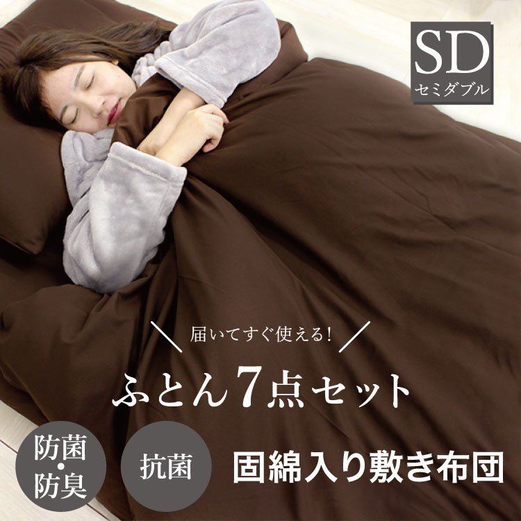 - 布団セット セミダブル 7点セット 洗える 敷布団 掛布団 枕 抗菌 防臭 防カビ ほこり 出にくい カバー 来客用 収納袋付 寝具 ふとん 茶色