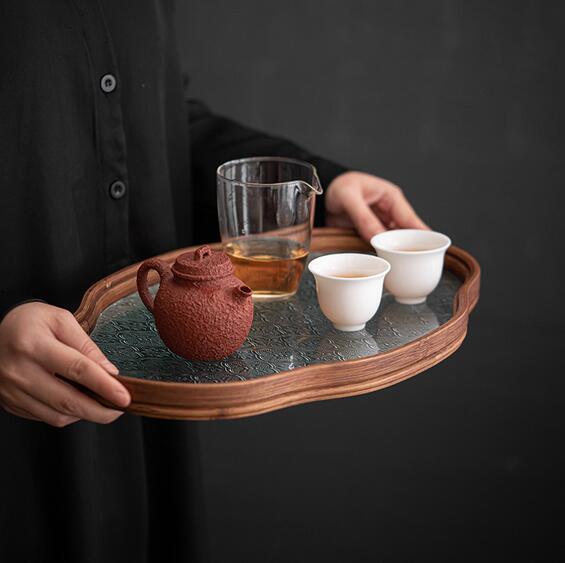 - トレー茶席トレイ 花海堂柄 ガラス 胡桃の木 木製 お盆 昭和 おしゃれ インテリア 小物入れ 茶道具 中国茶器 急須受台 急須置き 茶托
