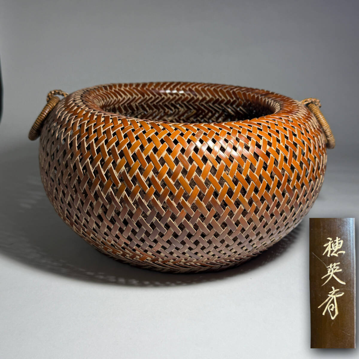 - 【茂蔵】穂英斎作 竹二重編遊環双耳籠 網代細工竹籠