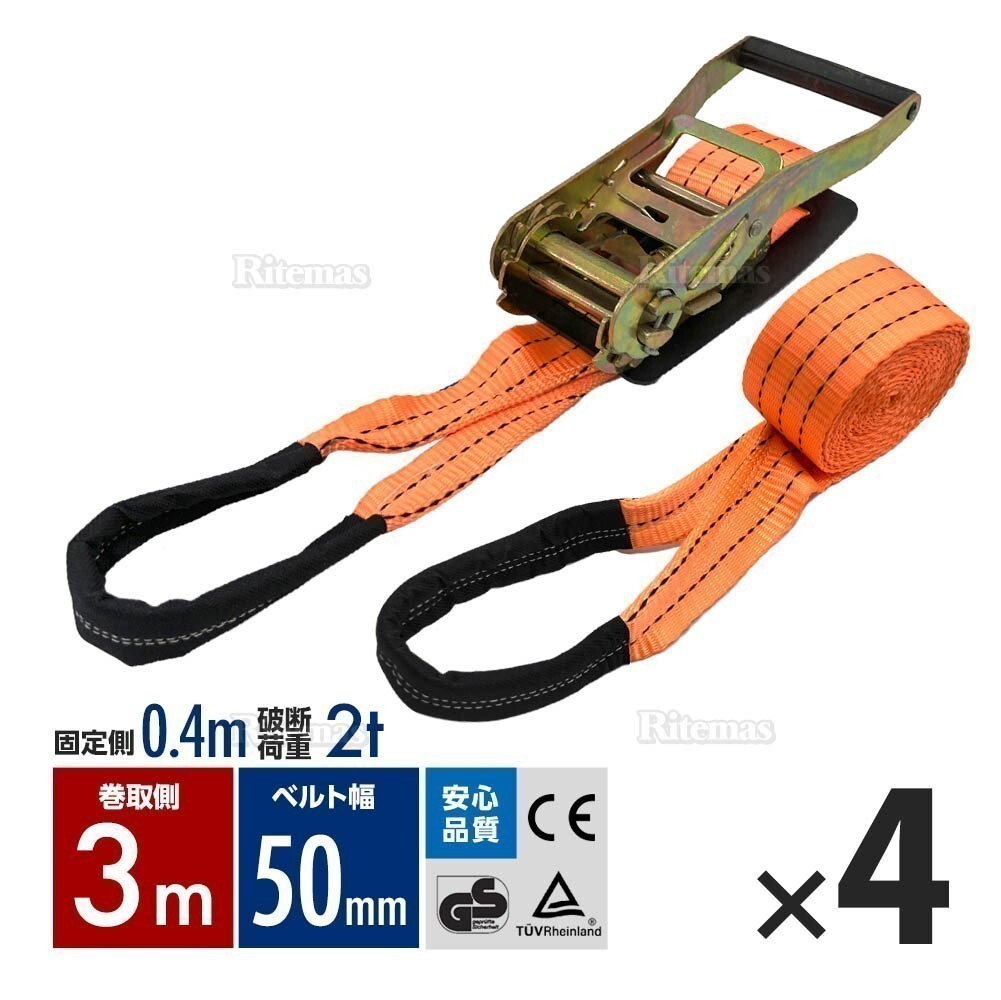 > ラッシングベルト ワッカ トラック用 幅 50mm ラチェットベルト ラチェット式 固定側0.4m 巻側3m 荷重2000kg タイダウンベルト 4本 1年保証