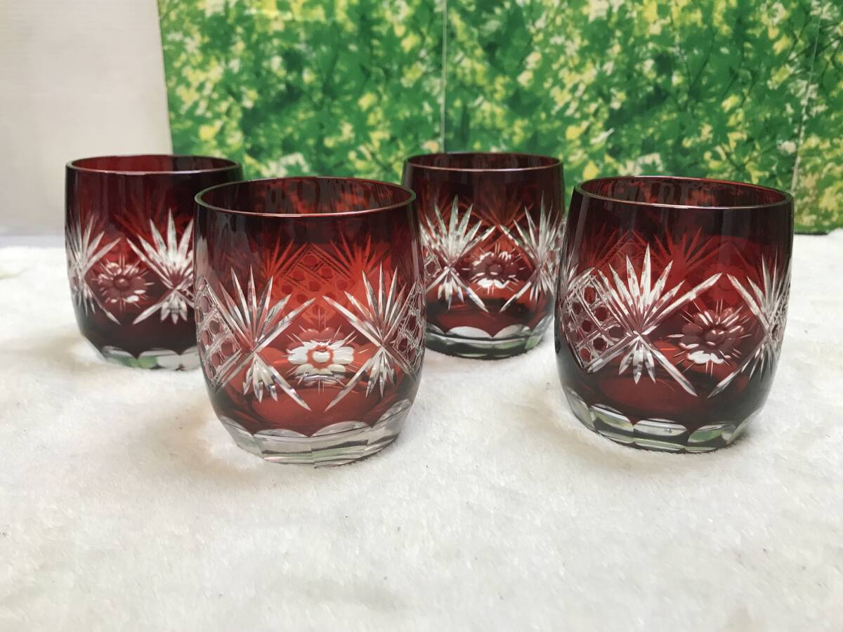 - 保管品 伝統工芸品 昭和レトロ 切子グラス 4客セット 気泡付き 江戸切子 ロックグラス