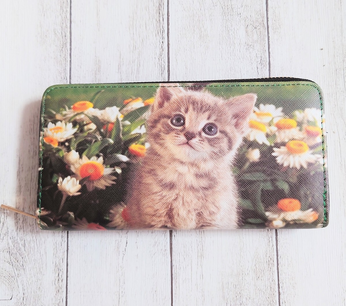 - 猫ちゃん プリント ラウンドファスナー 長財布 財布 ねこ ネコ マーガレット かわいい 猫プリント 花 ウォレット