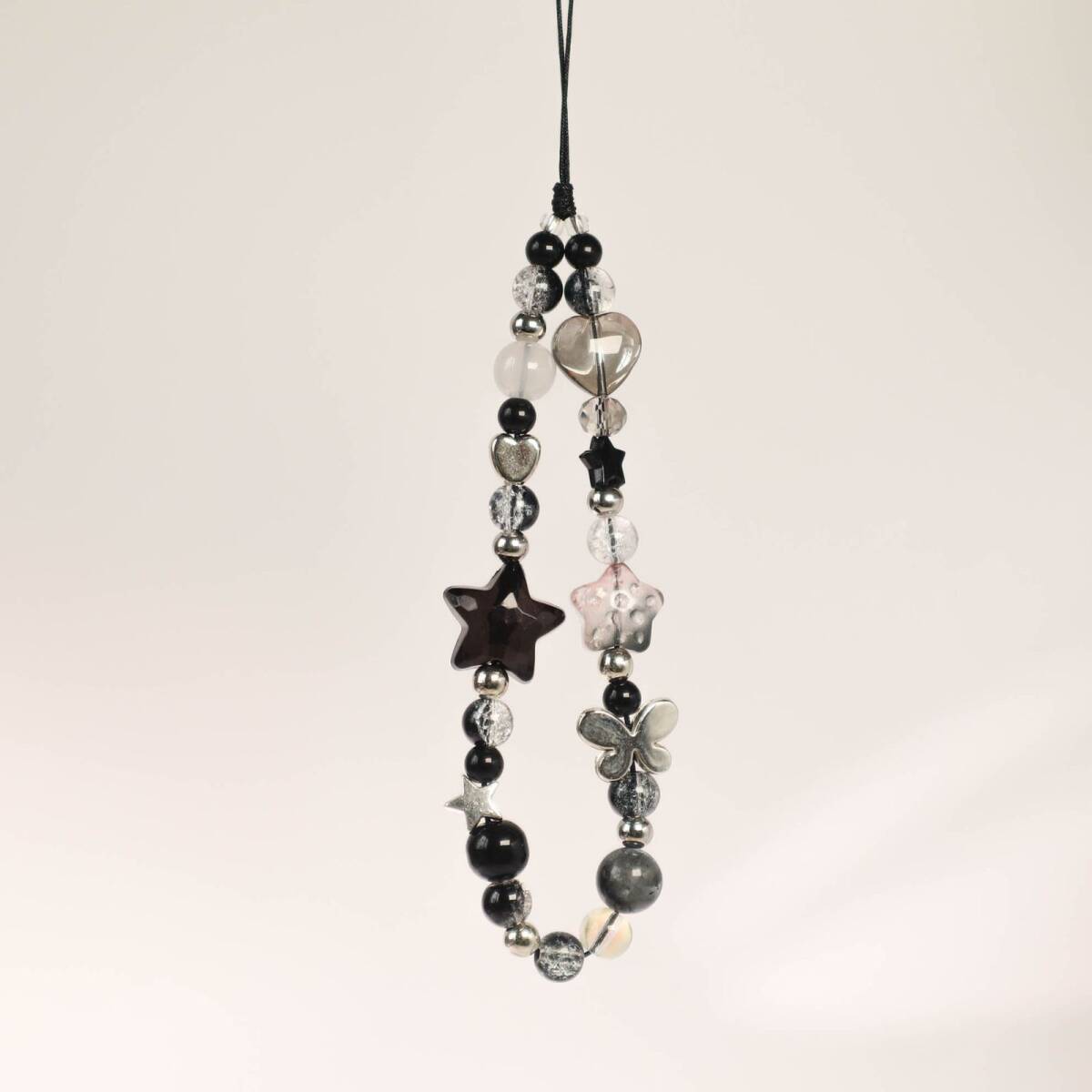 - スマホ ストラップ 黒 ビーズ パール 星 スター キラキラ 韓国 リボン 手首 落下防止 iPhone キーホルダー チャーム おしゃれ Y2K CD0126