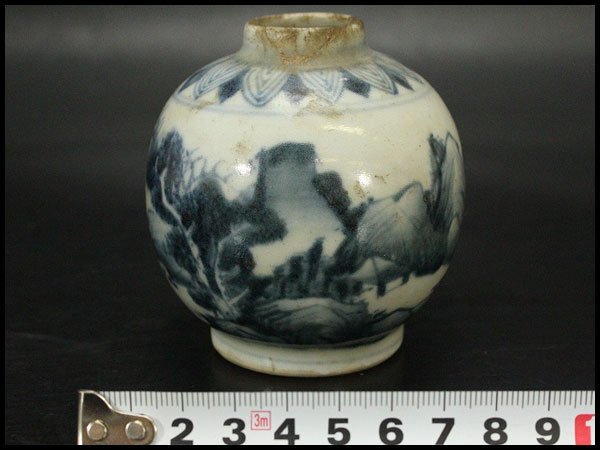 - 【銀閣】中国美術 青花 山水紋 茶入 小壷 高8cm 古染付 旧家蔵出 送料無料(ZE155)