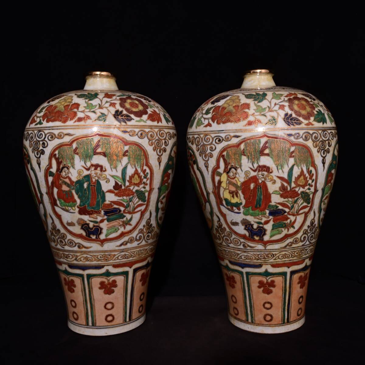 > A_YF0539【惠】人間国宝 中国骨董 陶芸 磁器【元代大元国之正八年款五彩蒔絵四愛紋梅瓶です】工芸品 施釉陶 青花磁 陶芸 置物 收藏品