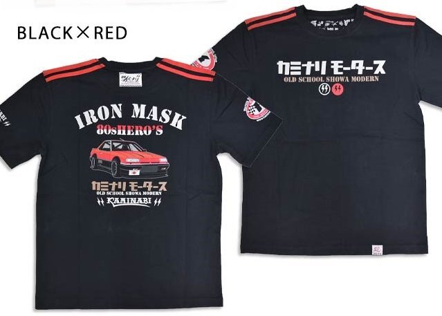- 半袖Tシャツ「IRON MASK」◆カミナリ ブラック×レッド Lサイズ 大排気量 KMT-260 雷 エフ商会 昭和 レトロ 鉄仮面 スカイライン