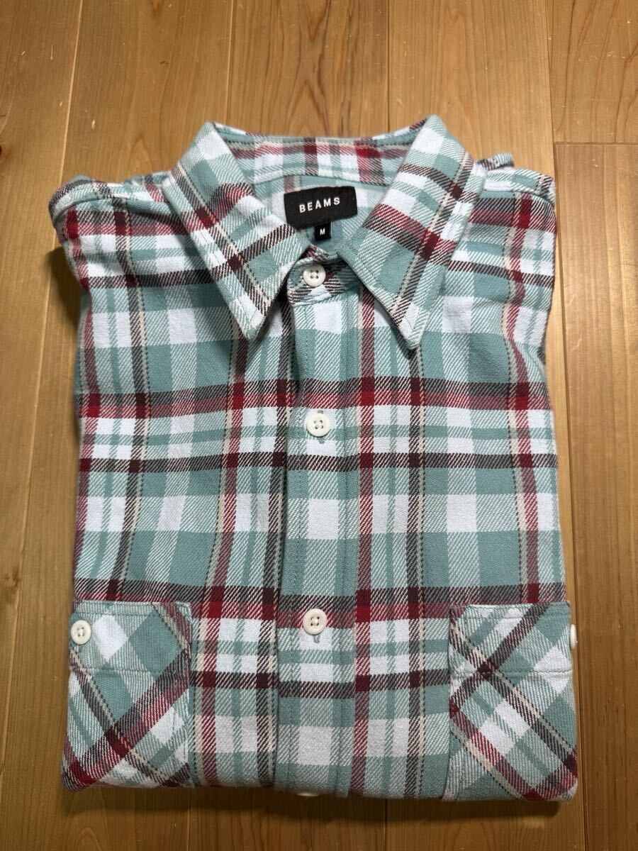 - BEAMS チェック柄 赤×水色系 長袖シャツ サイズM
