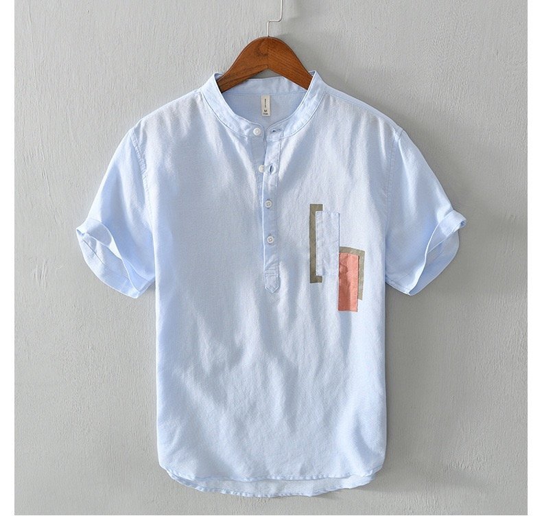 - リネンシャツ 半袖 メンズ トップス カジュアルシャツ 開襟シャツ 無地 麻綿 カプリシャツ スタンドカラーシャツ 夏服 父の日 ブルー XL