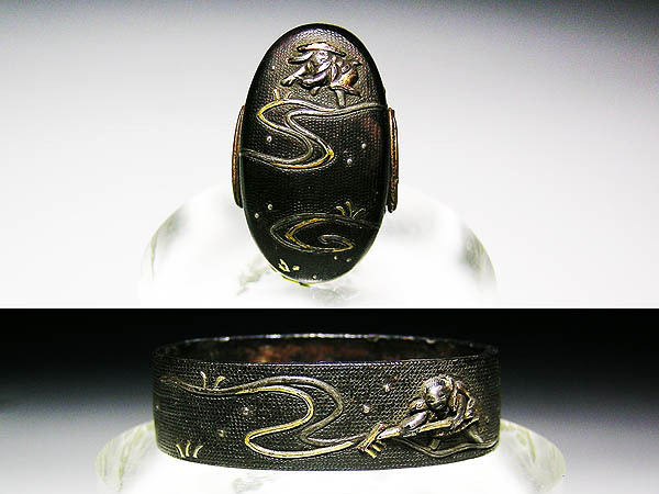- 【桃】刀装具:金工金銀象嵌農耕図縁頭