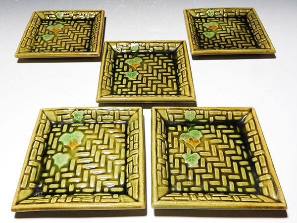 - 【桃】珉平焼茶釉三彩陽刻網代に蔦文様図四方小皿 五客