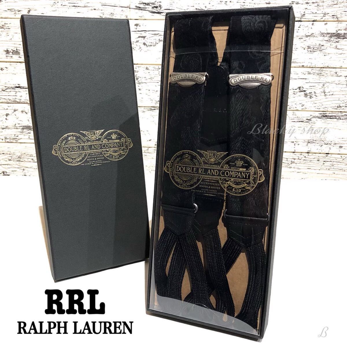 > RRL ラルフローレン サスペンダー 未使用 タグ 箱付き ブラック ロゴ ペイズリー 牛革 絹 ブレードエンド ボタン留め レザー 絹 シルク ②