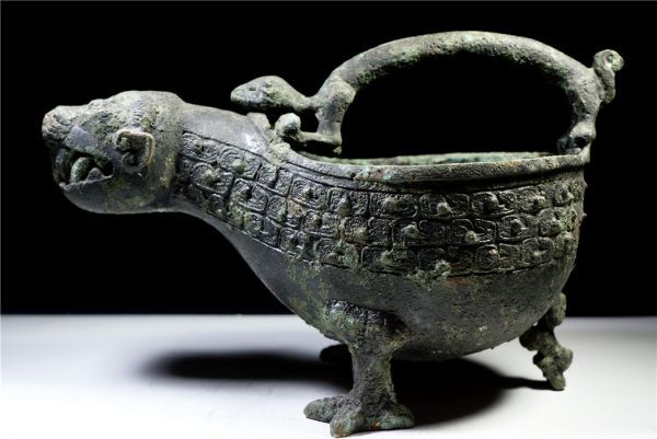 - 青銅器 西周 神獸高彫 取手盛酒器 無銘 開運置物 出土物 長さ22cm