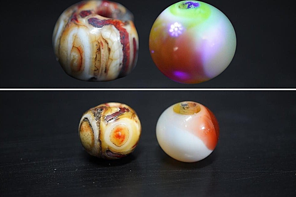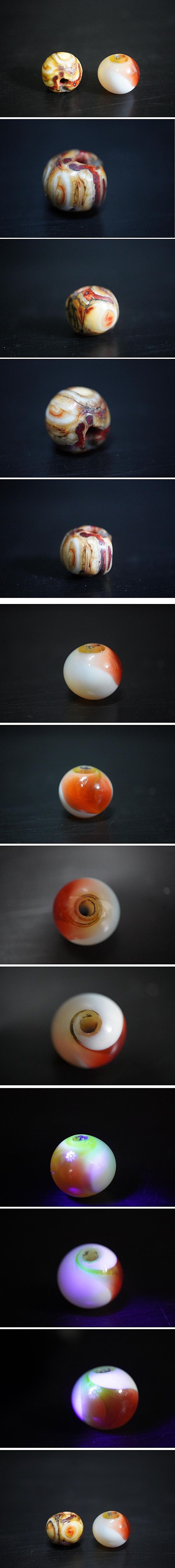 - D5742-2 時代堤物 緒締玉 2点 [鶴天 鶴頭 緒締玉] [ウラン硝子乳白赤色煉込 蜻蛉玉] 根付