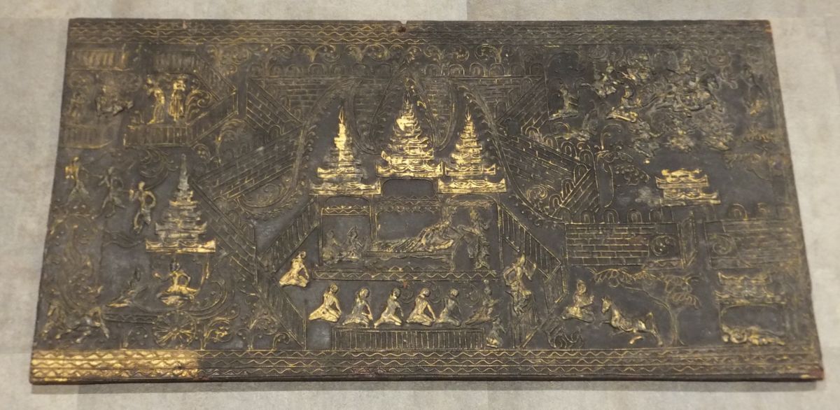 - 「木彫レリーフ板 釈迦涅槃図」仮題 金泥塗 1枚|東洋インド美術東南アジア浮彫芸術 仏伝本生潭 宮殿楼閣 馬 飛天舞踊 人天供養図