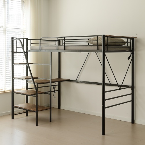- S ロフトベッド 階段付き デスク付き S パイプベッド シングル 収納 スチール 耐震 ベッド パイプベッド フレームのみ【Sシングル】