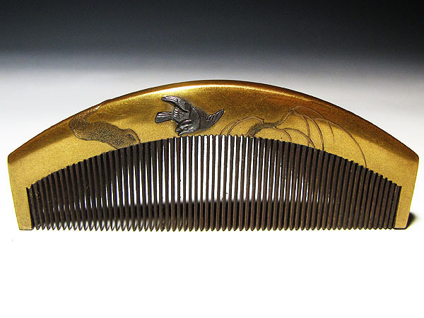 - 【桃】アンティーク髪飾り:金蒔絵に銀工春柳燕図櫛
