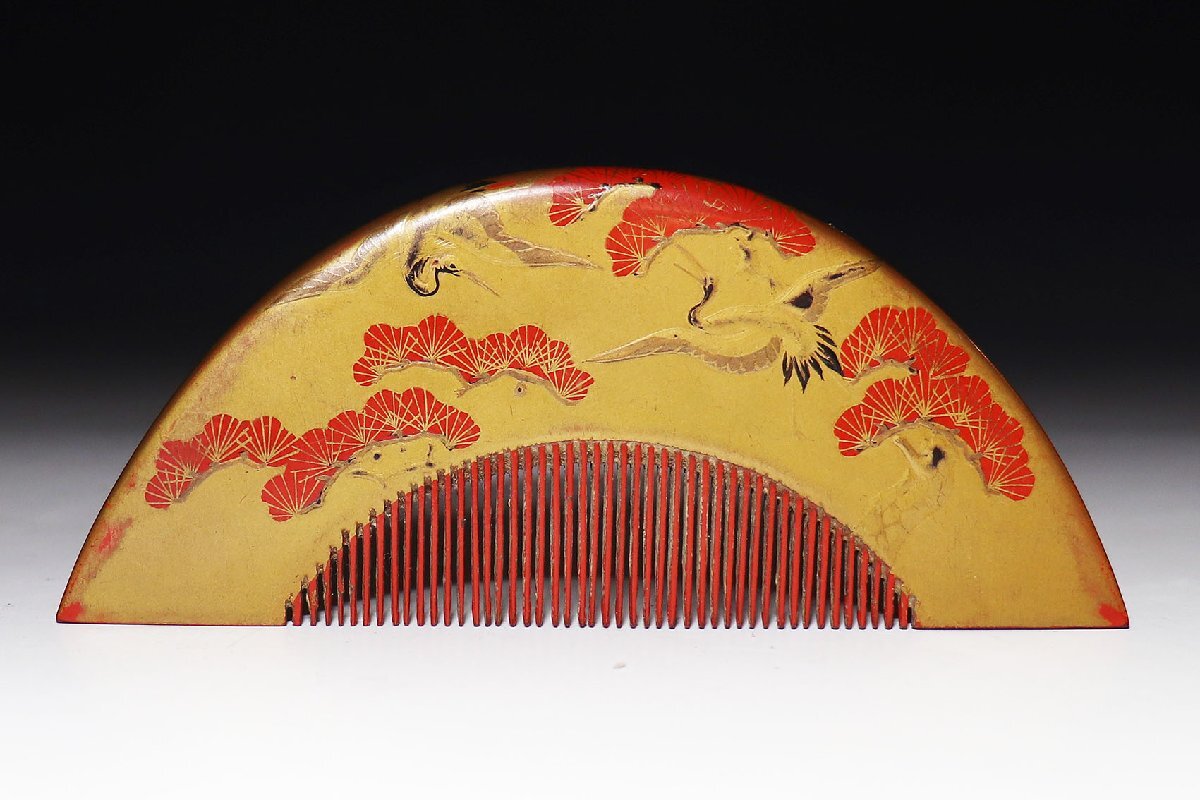 - 【桃】アンティーク髪飾り:江戸蒔絵松に舞鶴図櫛