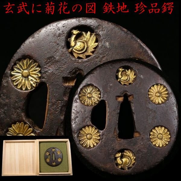 > 【 恵 #1879 】 珍しき構図の一品!金象嵌の美しい玄武に菊花の図 鉄地 珍品鍔 検:鍔/縁頭/切羽/ハバキ/刀剣/刀装具
