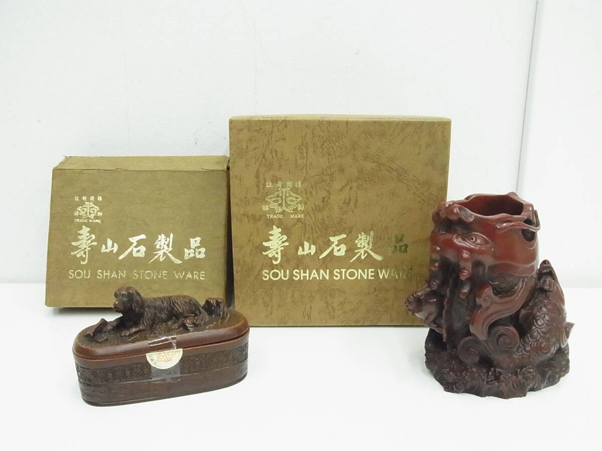 - 骨董品 寿山石製品 筆立て 印鑑ケース(練朱肉付)2点セット 獅祥 東洋彫刻 石彫刻 置物 工芸品 戌 鯉 龍 中古品