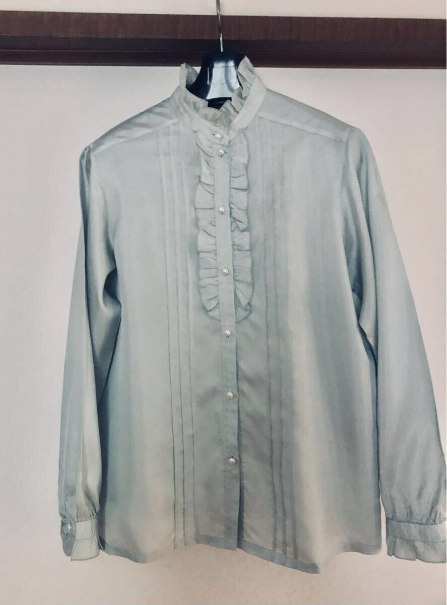 - 9号、Mサイズ、フリル付 長袖ブラウス シャーベットグリーン パールボタン