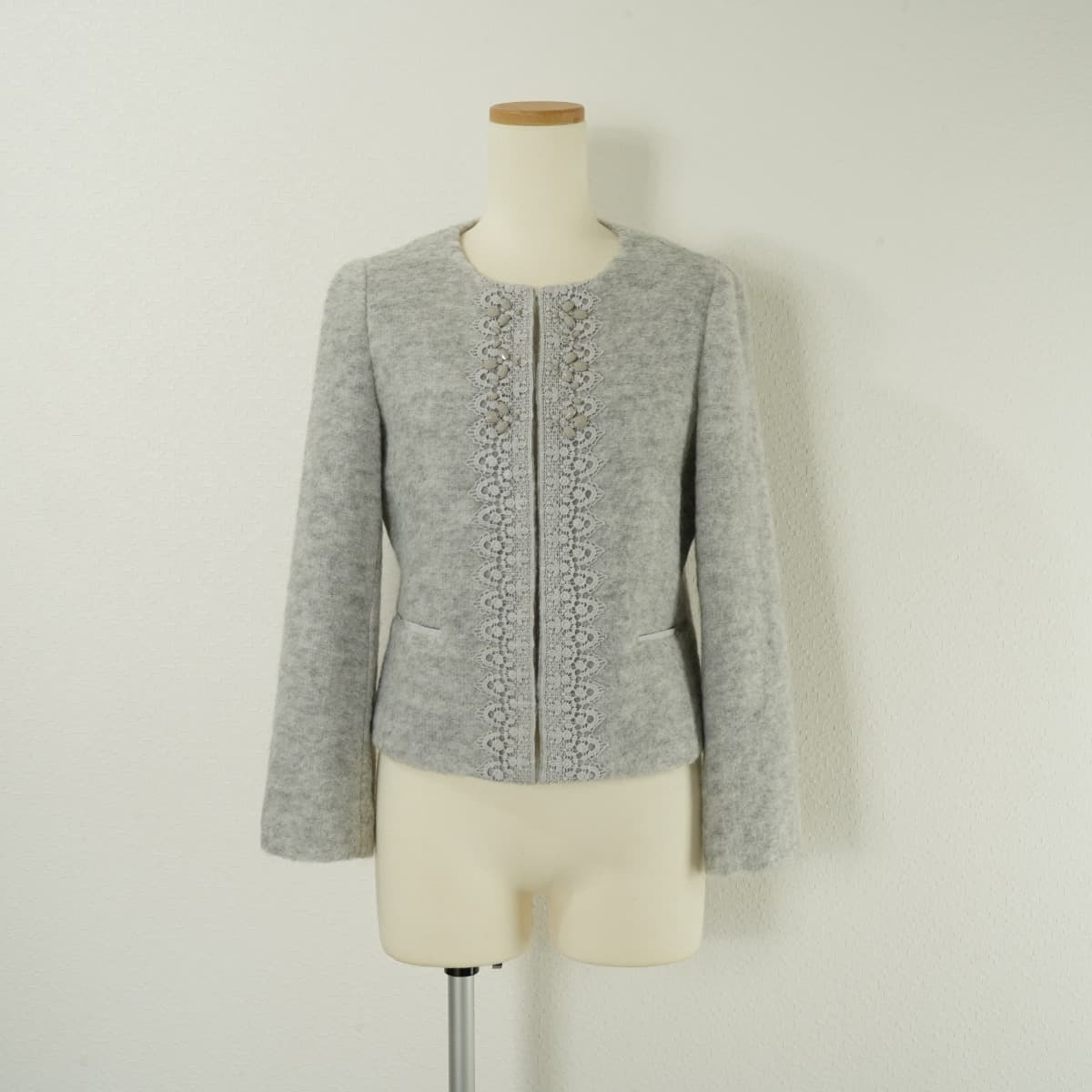 商品名:未使用 Sunauna スーナウーナ ノーカラー ジャケット 羊毛 モヘア混 ノーカラー ジャケット ビーズ レース ライトグレー 38