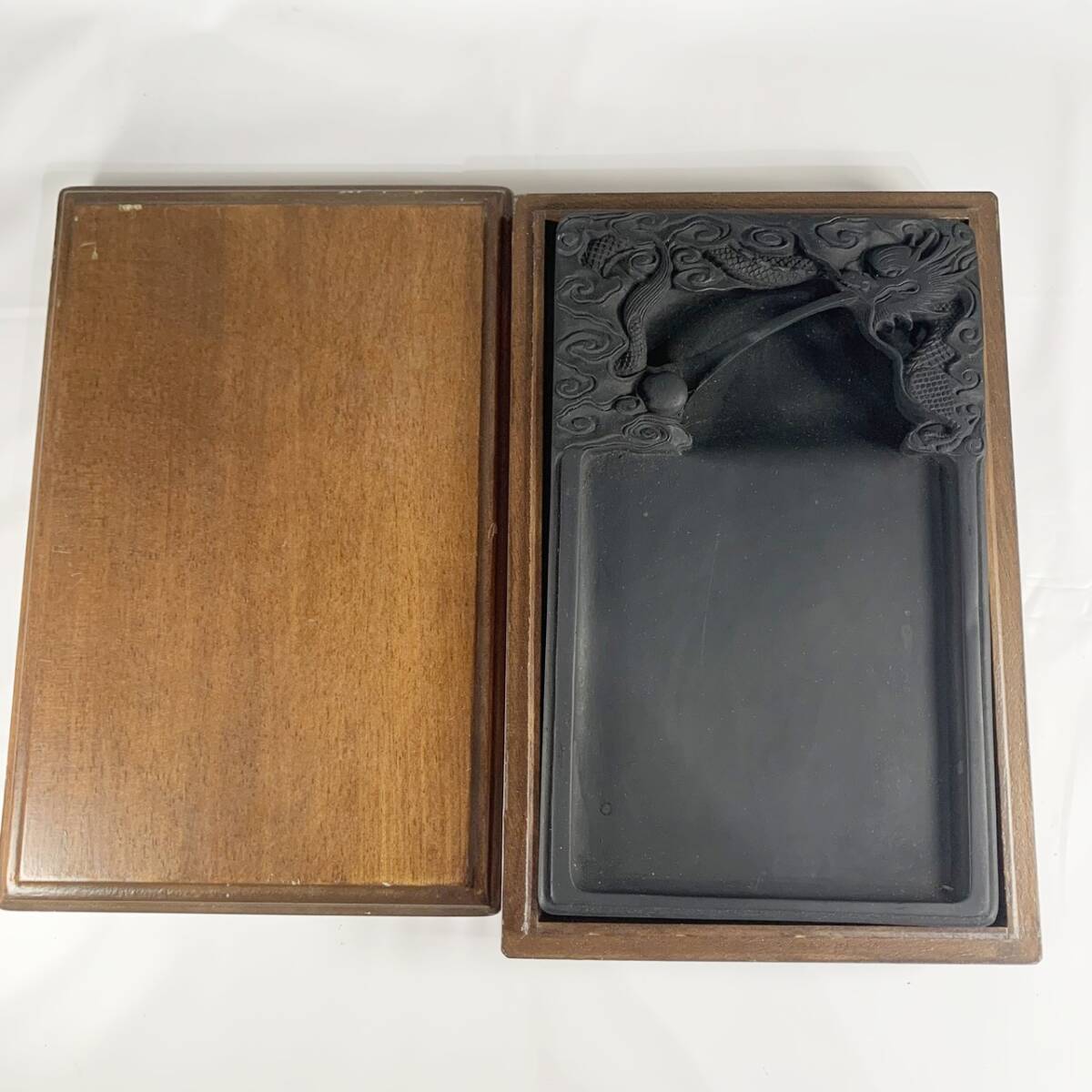 - usH-3356【希少・文房四宝】端渓硯 硯 スズリ 竜の彫刻入り 煙龍破墨 書傅香 書道具 古硯 大きい硯 木箱入り