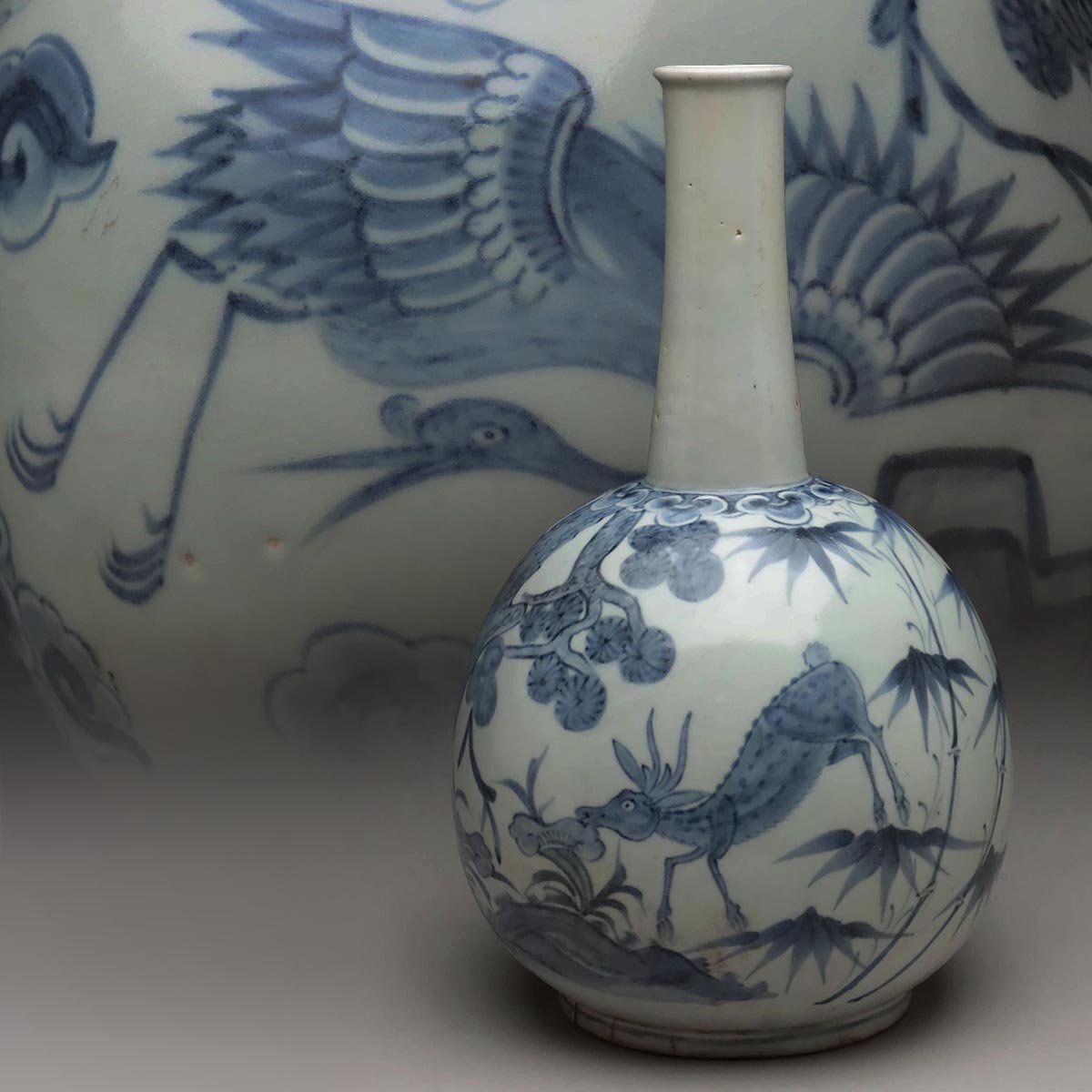 - EU963 朝鮮古美術 李朝 分院窯 青花白磁 染付十長生文瓶 高28.5cm 重2.1kg 木箱附・白磁染付松竹鹿鶴文花瓶・花入 李朝後期 朝鮮古陶