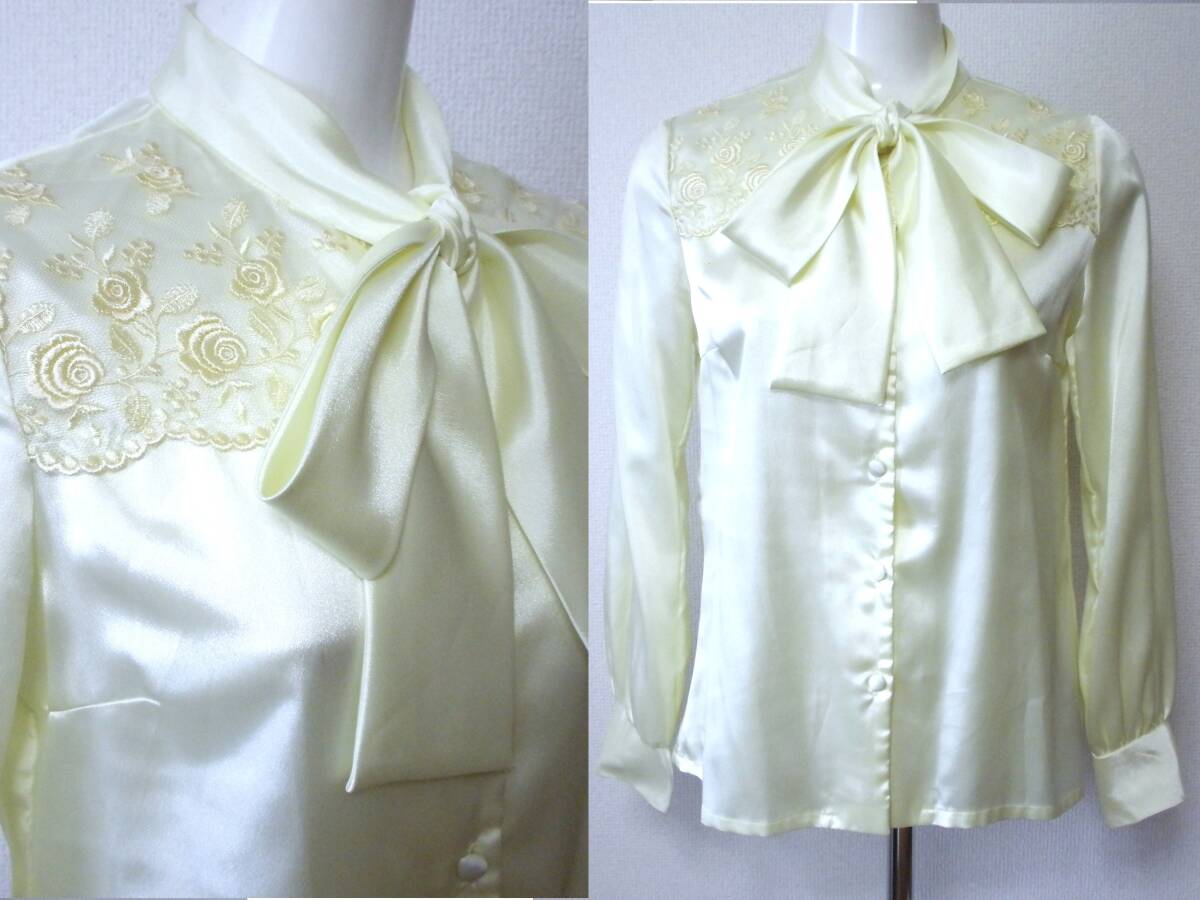 - レトロ 古着 光沢感 レモンイエロー レース リボン シャツ ブラウス★昭和 ヴィンテージ vintage クラシカル フォーマル
