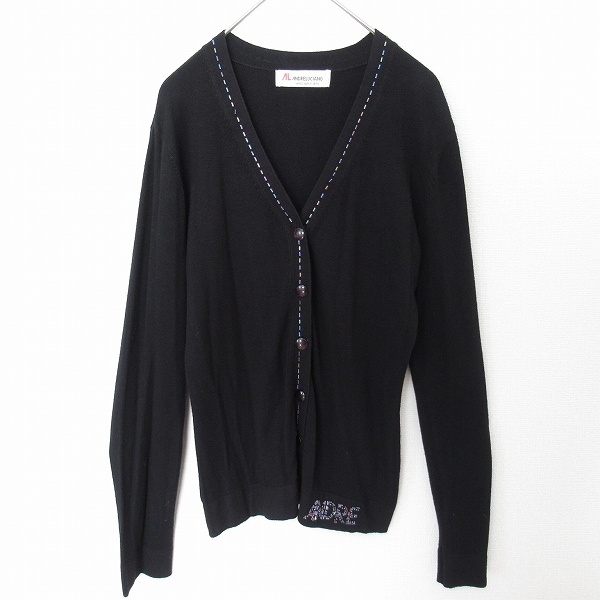 【ブランド】アンドレルチアーノ ANDRELUCIANO【アイテム】カーディガン【表記サイズ】-【平置き実寸】肩幅:約 42cm袖丈:約 59cm身幅:約 41cm着丈:約 54cm【状態】目立った傷汚れなし【備考】-【色】ブラック系【素材】画像をご参照ください。★当店の商品はすべてリユースアイテムとなります。特質上、些細なダメージは記載しておりませんので着用に問題のない使用感、着古した雰囲気などはご了承くださいませ。キーワード/アクイール/古着/used/ビンテージ/ヴィンテージ/昭和/レトロ/ビーズロゴ//羽織り/