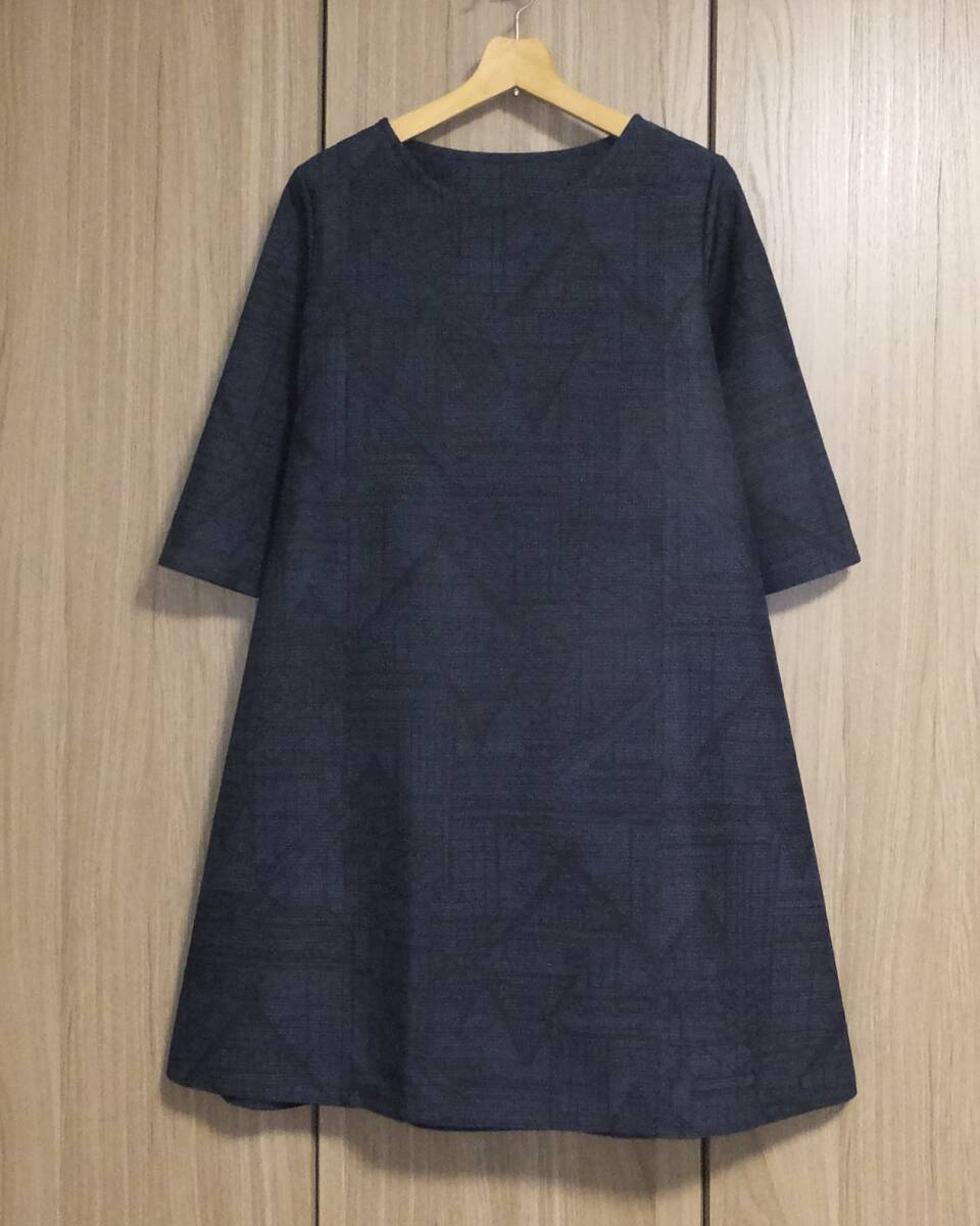 - ♪送料無料 ハンドメイド 着物リメイク 古布 正絹 紬 建物・風景 紺系 シンプルAラインワンピース♪