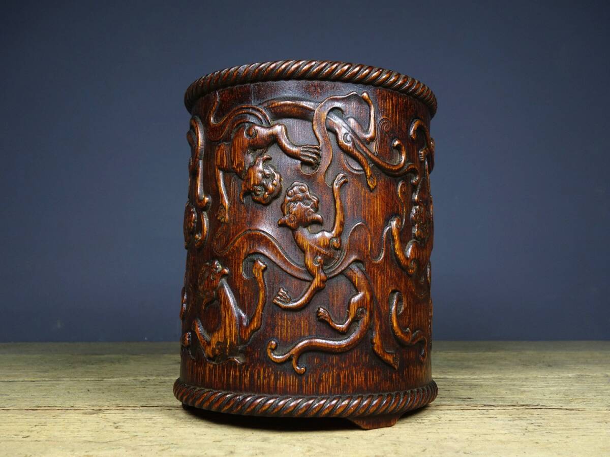 - 【超珍館蔵】竹材 細密彫 璃献瑞紋 筆筒 筆立 文房具 書道品 置物 賞物 古賞物 古董品 古美術品 時代物 旧家蔵出 稀少珍蔵品