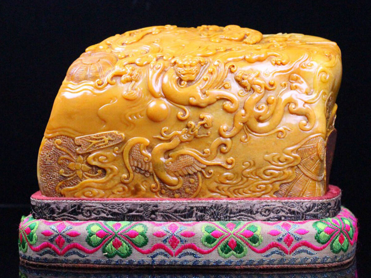 - ▽鴻▽清朝時代 寿山石 田黄石彫 龍鳳紋印章 之謙作 箱付 置物 時代物 中国古美術 骨董品