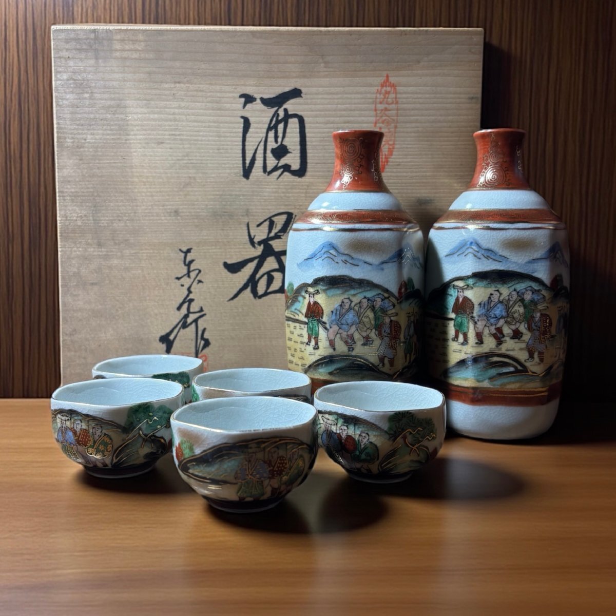 - 【FU10】九谷焼 酒器揃 東光作 参勤交代図 共箱 お猪口 ぐい飲み 湯呑み 酒器 陶器 在銘 作家物 骨董品 アンティーク