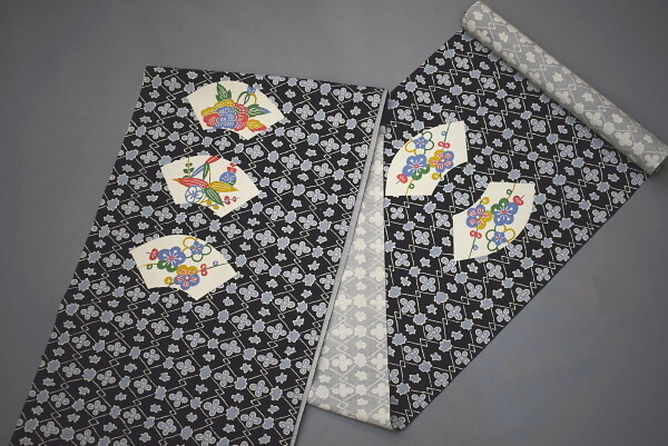- A21-4【凛々】即決 新古品 正絹 紅型調 染名古屋帯 黒 扇面 梅 未仕立て品