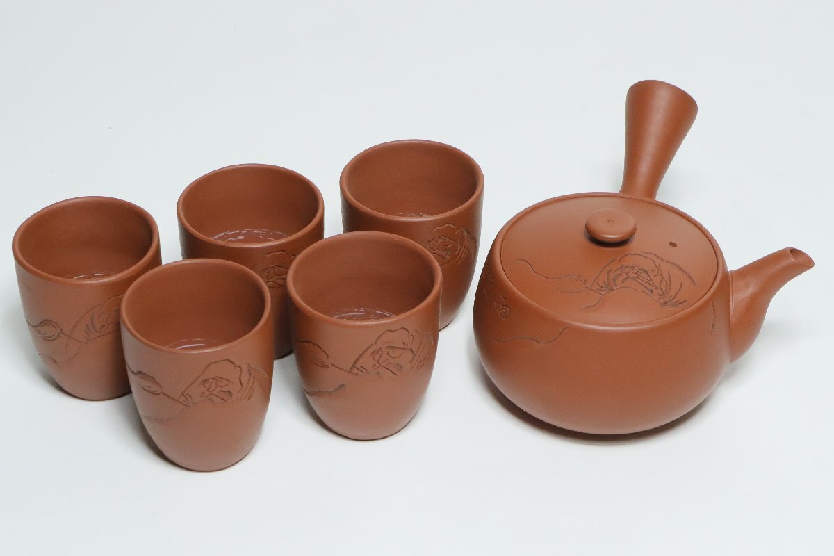 ・常滑焼 白雲 朱泥 茶器揃 漢詩風景図 /朱泥急須 常滑白雲 番茶器 湯飲み 煎茶