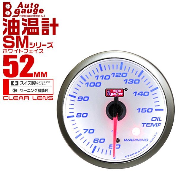 - オートゲージ 油温計 52mm クリアレンズ 追加メーター ワーニング機能 ブルーLED オイル 温度 スイス製モーター仕様 白 SMシリーズ