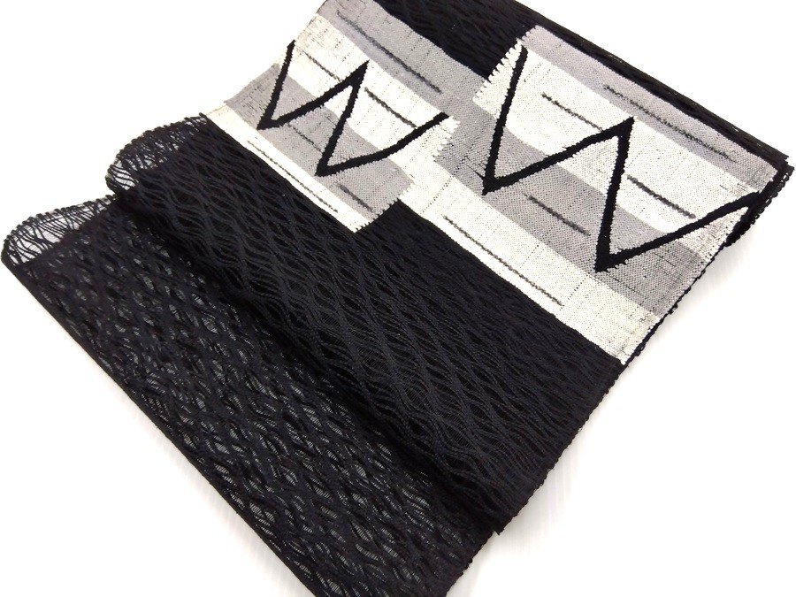- 名古屋帯 正絹 羅織り 八寸 夏用 黒 ブラック 波 幾何学模様 反物 064