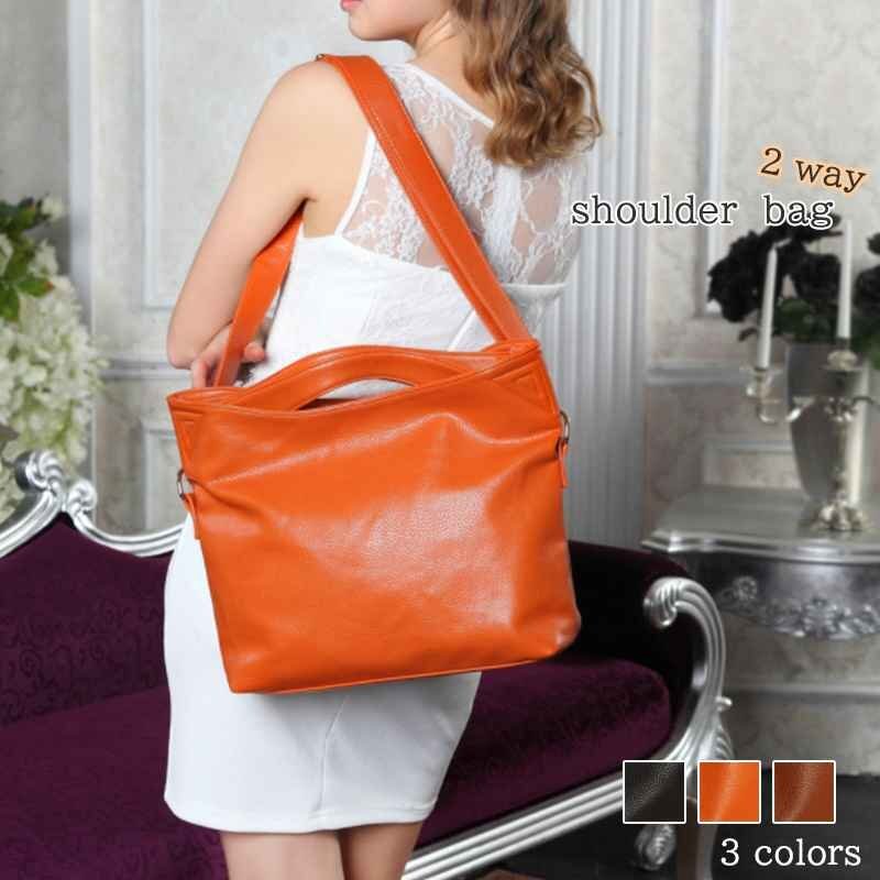 - レディース トートバッグ 手持ち ショルダー かっこいい レザー調 大容量サイズ 2way フリー オレンジ