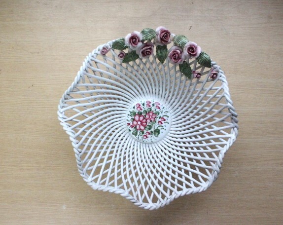 - ▲な-555 フルーツ皿 イタリア製 グッビオ 陶芸 バラ 最大高さ9.5cm最大幅20.5cm底径8.5cm