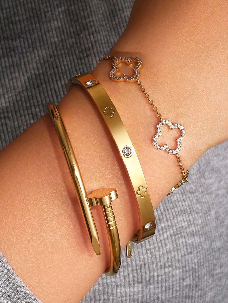- ジュエリー レディース セット ステンレススチールネイル&四つ葉のクローバーブレスレットセット3個入り、女性の日常着に適し、クリス