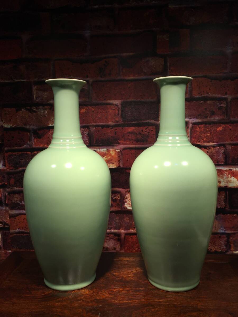 > PTA#0821【3.1】中国骨董 人間国宝 磁器【青磁龍泉窯磁器賞瓶【一対】です】工芸品 施釉陶 青花磁 陶芸 精美彫 置物 收藏品